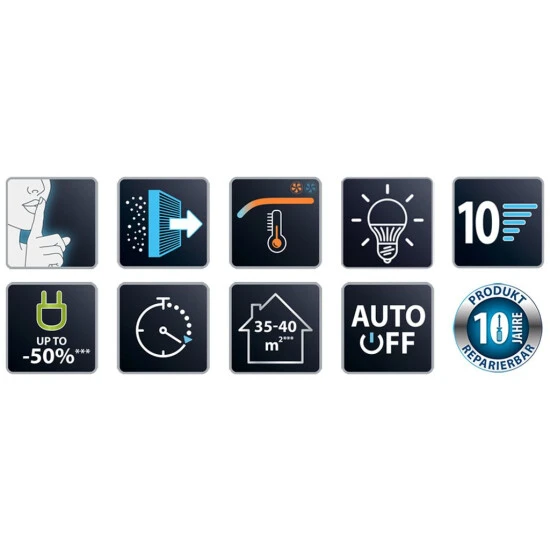 - 10 Geschwindigkeitstufen im Ventilatormodus (davon 3 sehr geräuscharme, 1 ist kaum hörbar – kein störender Lärm)